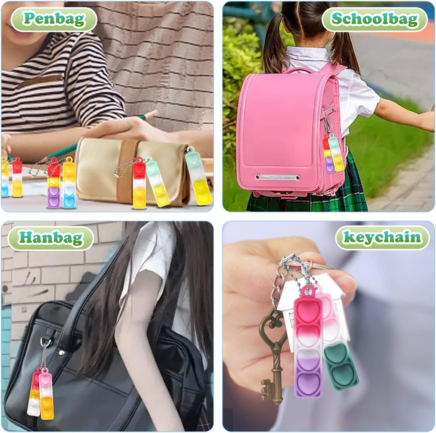 - ❤【New Exterior Design】Our new mini pop toys give deeper meaning to gift-giving with a love theme.It includes 100 pcs of mini keychains with different colors inside.The fidget toys made with a new design appearance,novelty style,fashionable and cute.The use of hanging hole design,more convenient to carry.You can hang the chain on your keys,backpack,pencil case,cell phone,or even on birthday cards,thank you cards,Valentine's Day,Easter,New Year's cards,Christmas cards.