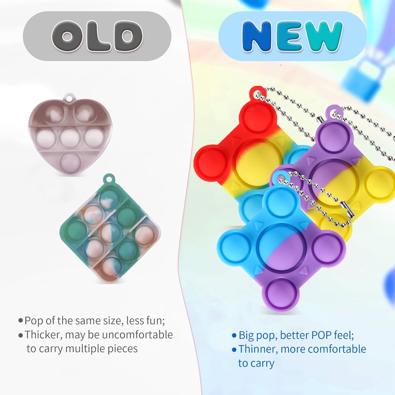 - πΉ High Quality New Materials: The New Big Pop Mini Keychain Fidget toys made of high-grade Silicone materials,The newly designed shape brings more freshness to the children, The newly designed big pop and small pop combine to make a louder "pop" sound.You can play it with children with complete confidence, it will not cause any harm to children, because it is very soft and feels comfortable.