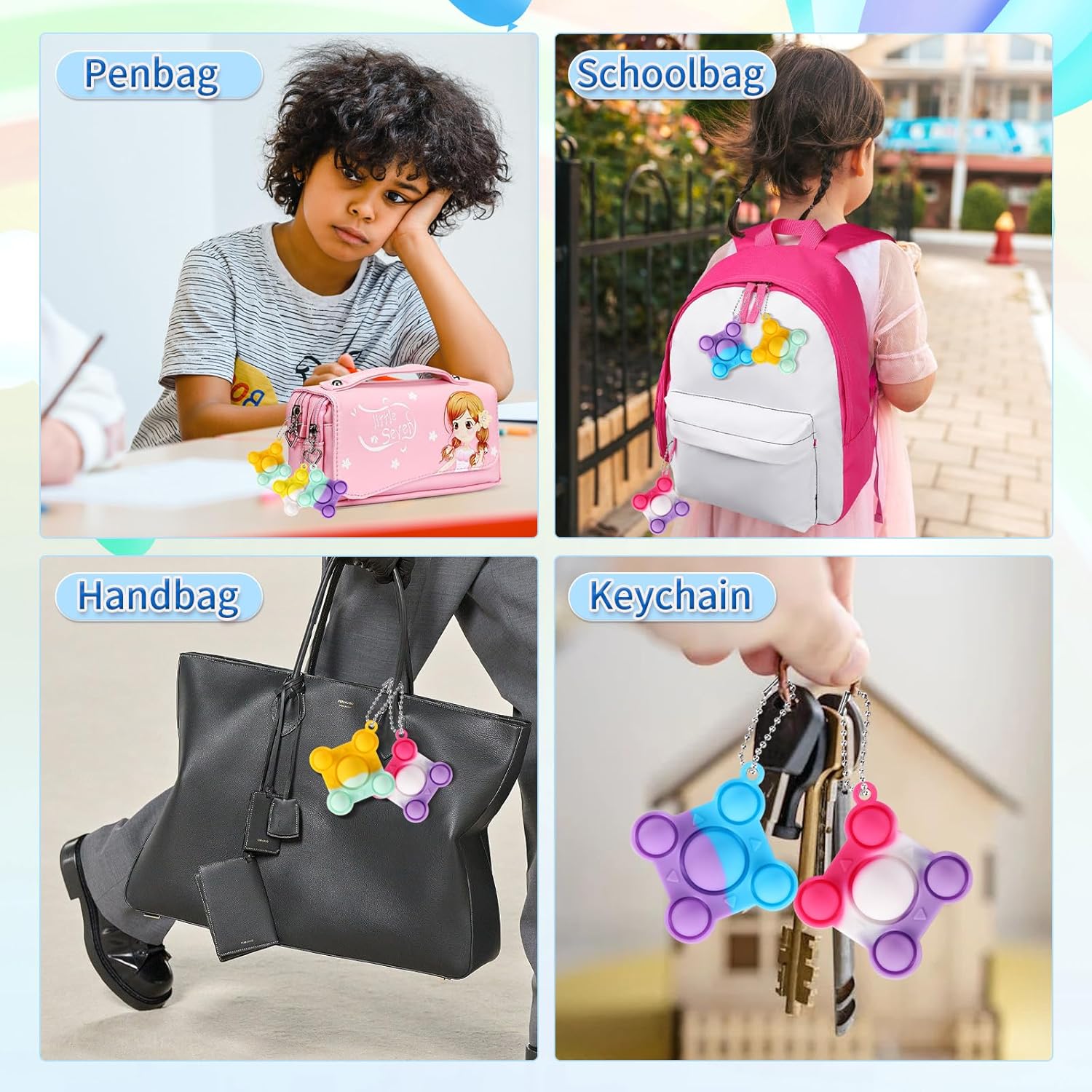 - πΉ Entertainment and Joy: These mini pop fidget toys are great for everyone.Fidget toys are durable and comfortable to the touch, and kids will love them and keep popping them. It can be reused and cleaned. It's waterproof so you can play anywhere, bathroom, pool, seaside.