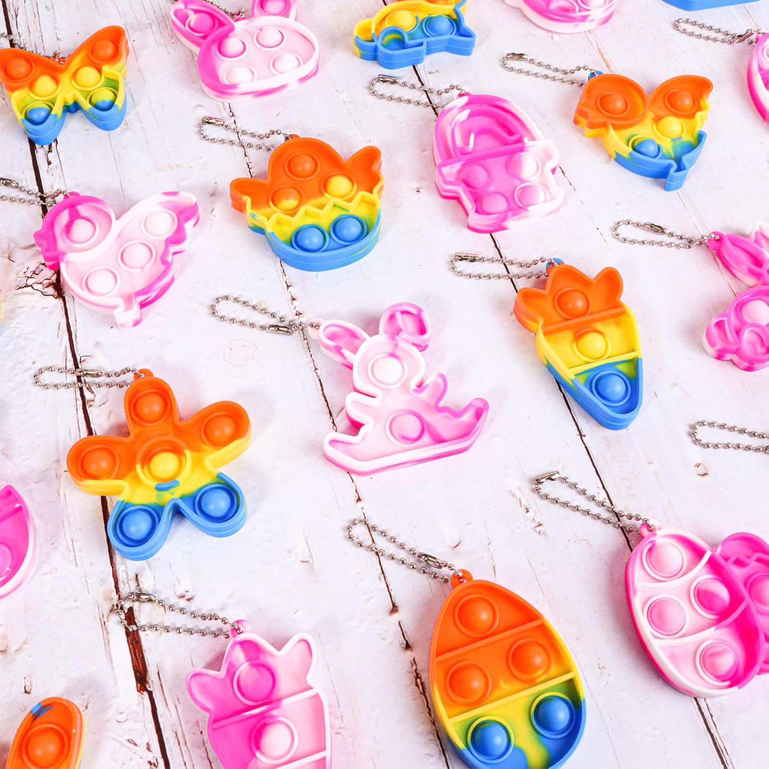 - 【12 Easter Styles】Mini Pop Bubble Dimple Keychains,They are designed as egg, carrot, chick, bunny, each style has 2 pcs, 12 different types of 24pcs in total,Easter classical elements,all in Easter theme.