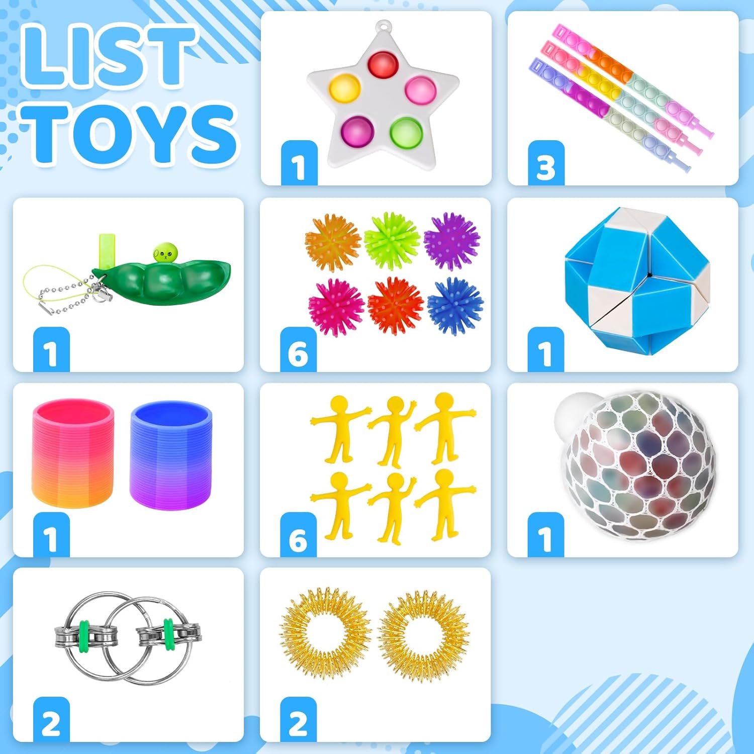 - 【100 Pcs Sensory Fidget Toys Pack】: Enhance Focus and Relieve Stress with our 100 Pcs Sensory Fidget Toys Pack. Discover the ultimate way to relieve stress and anxiety with our 100 Pcs Sensory Fidget Toys Pack. These toys are a fun way to keep the brain focused and the hands busy. With so many options, you'll never run out of ways to keep yourself entertained and engaged in various scenarios, whether it's during office work, waiting, meetings, or creative tasks like writing and designing.