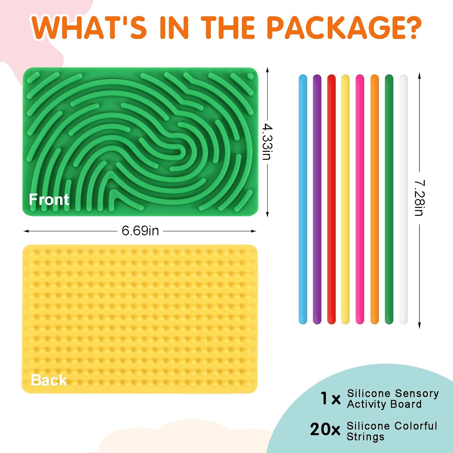 - 【Double Sided Busy Board】- With 2 silicone fidget toys and 20 strings. Sensory activity board with double-sided design for more play options, soft-touch, flexible silicone material, hours of fun for kids through pushing, peeling, tying and bridging