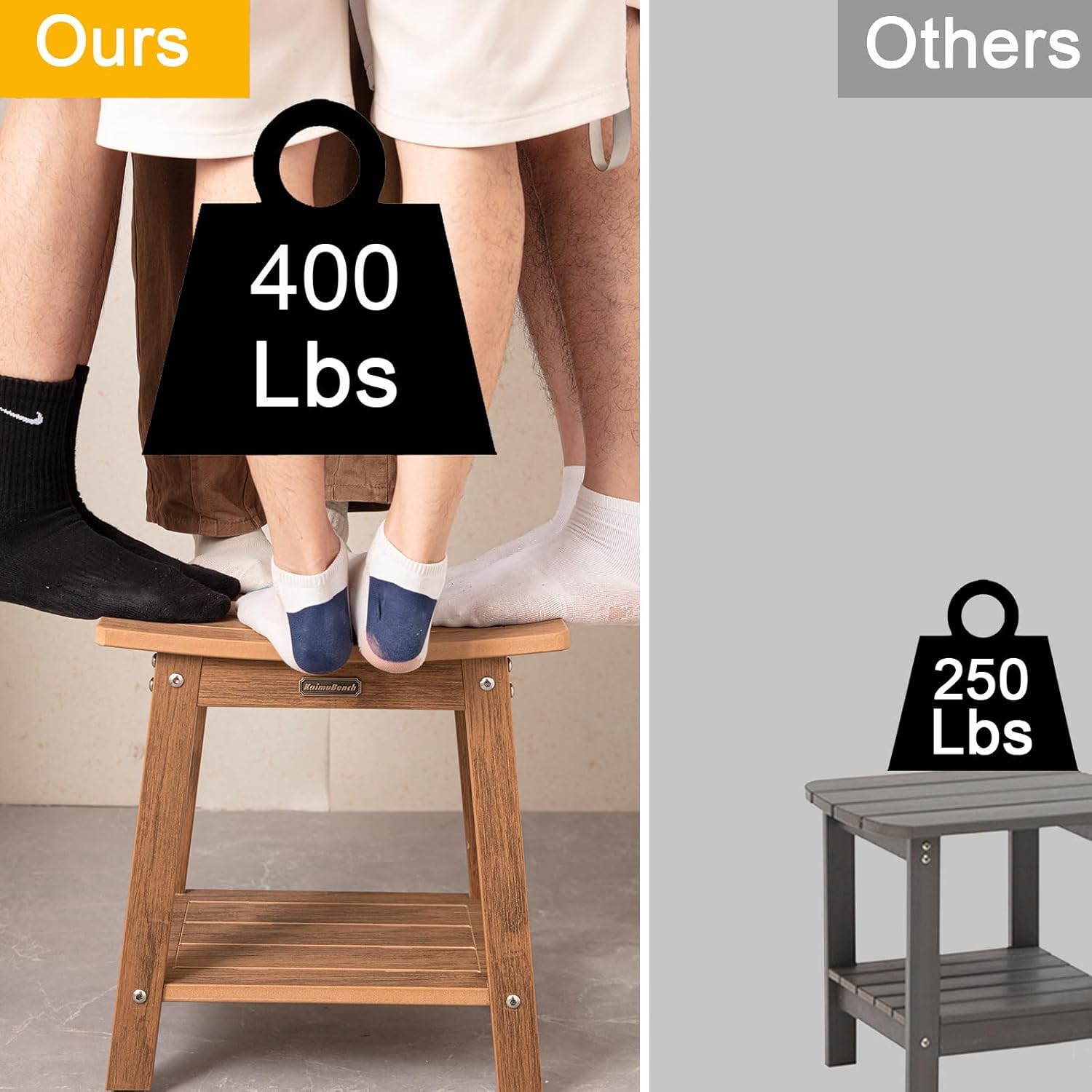 - 【Material & Size】Our poly shower bench is made of HDPS (polystyrene) with 304 stainless screws which never gets rust, this material is not easy to get rotting or crack after prolonged exposure to humidity, no splinters and no maintenance, 16 x 12.6 x 17 Inches enough large to sit (THE MOST IMPORTANT IS NO MAINTENANCE)
