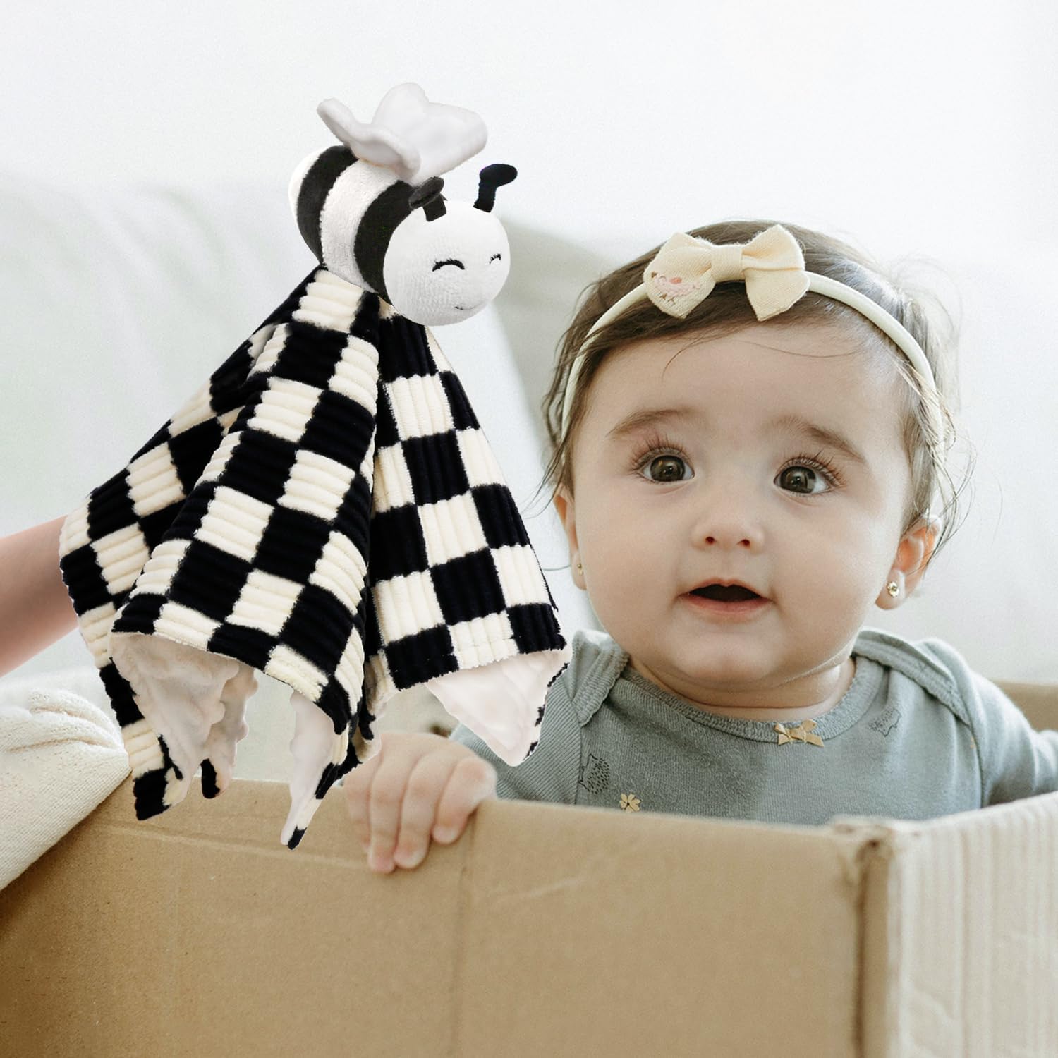- CUTE DESIGN --- Our lovely baby security blanket features black and white color combinations with 3D stripe gingham design. And the eyes of lovey blanket are embroidered and safe for the babies. When the baby is 0-12 months old, the black and white colors are more attractive to baby and inspire the babyโs vision development