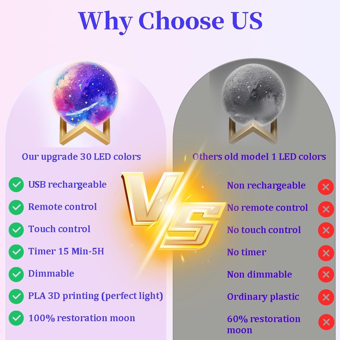 - 2025 Upgrade- We have added a charging function. When it is out of power, you can use a Type-C charging cable to charge it. And we have also added a remote control. You can use the remote control to switch 30 different light colors, and you can also use the remote control to set the timer function for 15 minutes -30 minutes -45 minutes -1 hour -2 hours -5 hours. Touch the metal ring of the moon lamp charging port to switch between 7 different light colors. It is so convenient.