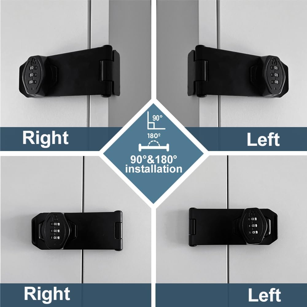 - Easy to install : Our cabinet password lock fits left or right side mounts and mounts at a angle of 90° or 180° .Just install the cabinet latch to your door frame with screws.