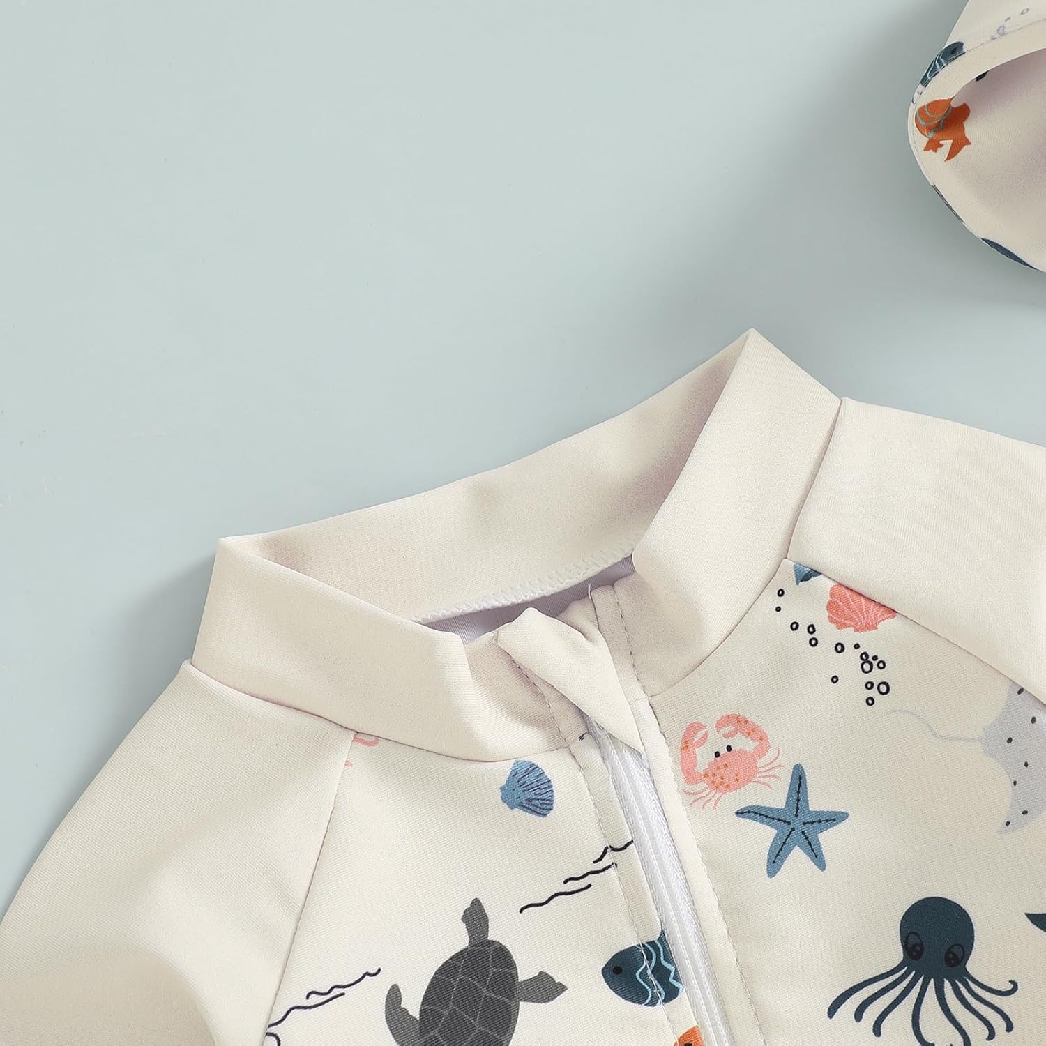 • Design: Toddler bathing suit boy, infant long sleeve swimsuit boy, round neck, back/front zipper closure for easy on and off, newborn swimsuit boy, dinosaur/marine animal print, super cute and lovely, your little boy will stand out in the crowd