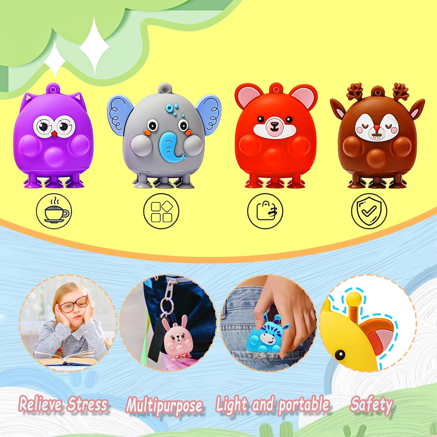 - KIDS FIDGET SUCTION TOYS: This package has some cute elephant *2, rabbit *2, penguin *2, bear *2, owl *2, giraffe *2, zebra *2, elk *2, a total of 16 well-designed styles. Squeeze the bubbles to make a "POP" sound! The bottom suction cup can be firmly attached to the glass and other places. The combination of fidget bubble toy and suction cup toy will help you unlock more new ways to play!