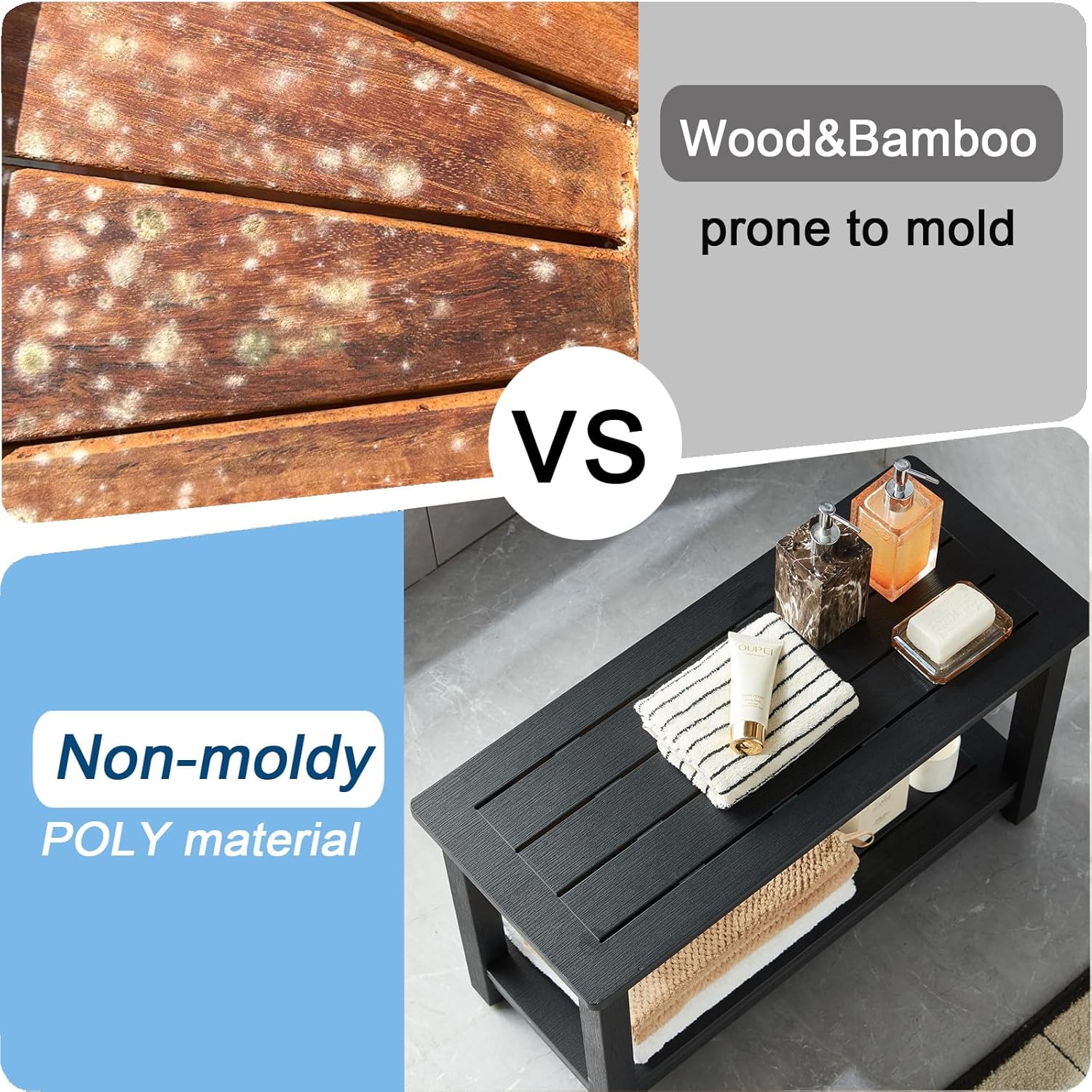 - ăAnti-mil-dew MaterialăOur shower bench seat is made of HDPS (polystyrene) with 304 stainless screws which never gets rust, this material is not easy to get m-o-l-d, rotting or crack after prolonged exposure to humidity, no splinters and no maintenance, 30 x 13 x 18 Inches enough large to sit (THE MOST IMPORTANT IS NO MAINTENANCE)