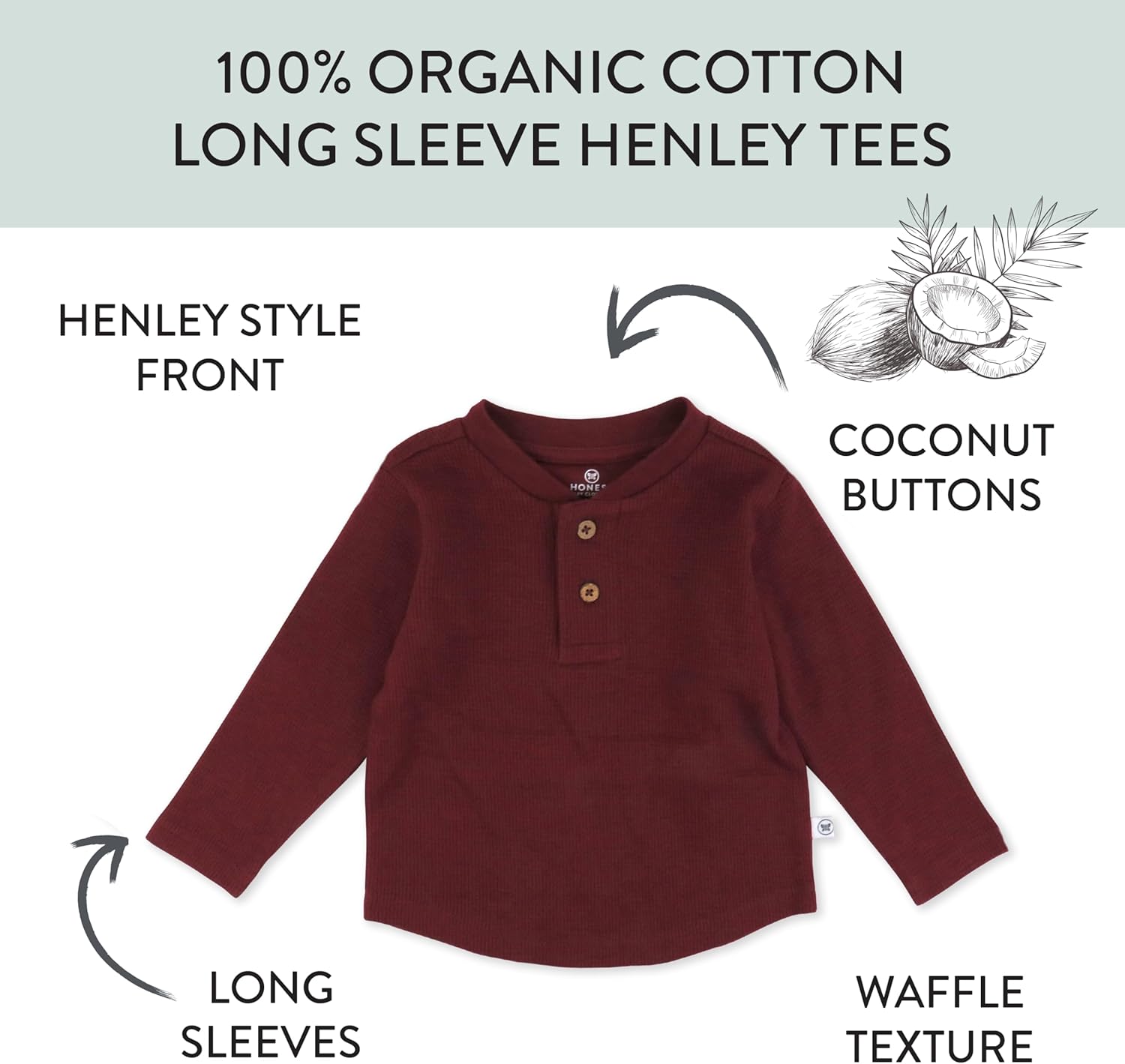 HonestBaby 5-pack Waffle Henley Long Sleeve Shirts 100% Organic Cotton for Infant Baby and Toddler Boys, Unisex